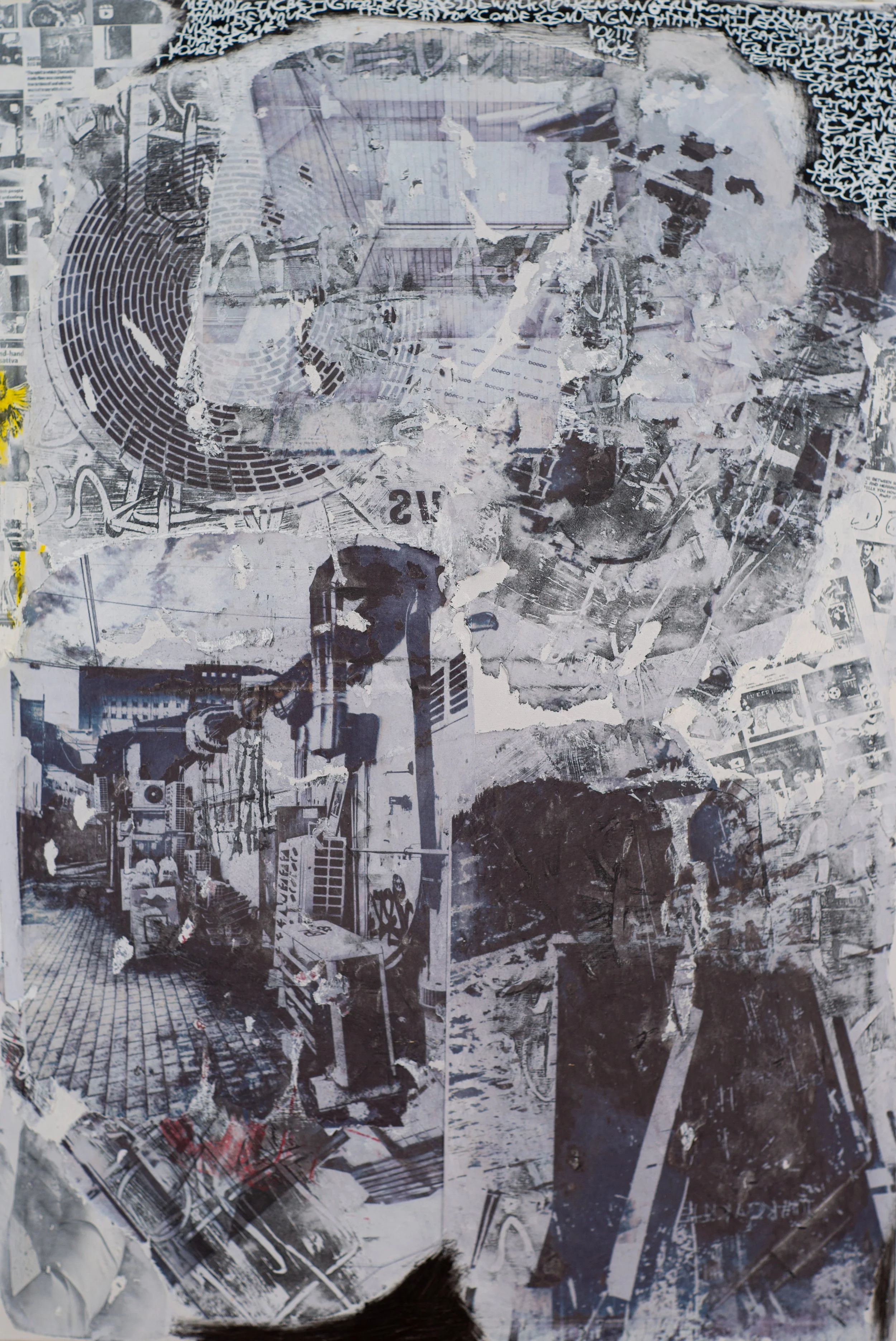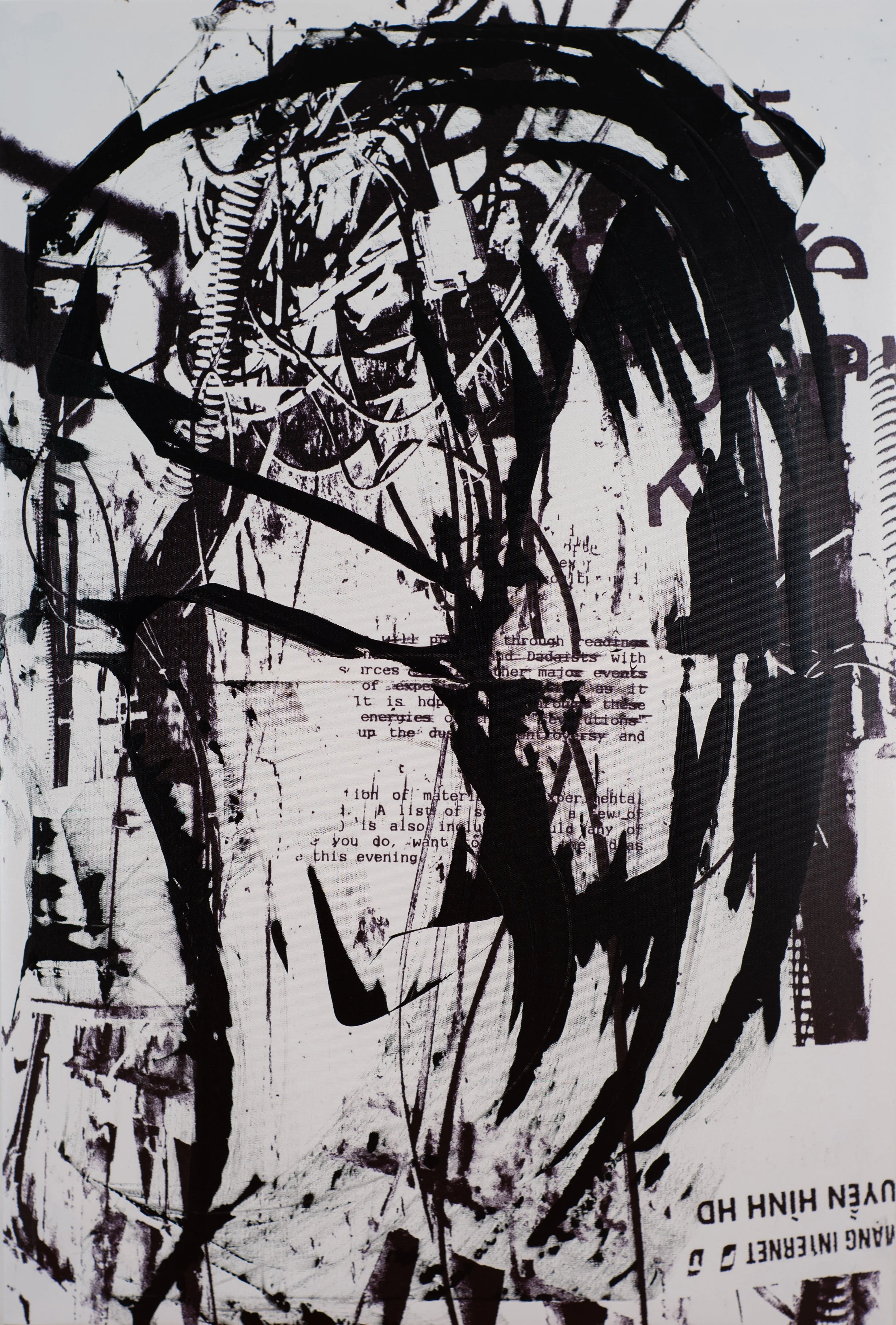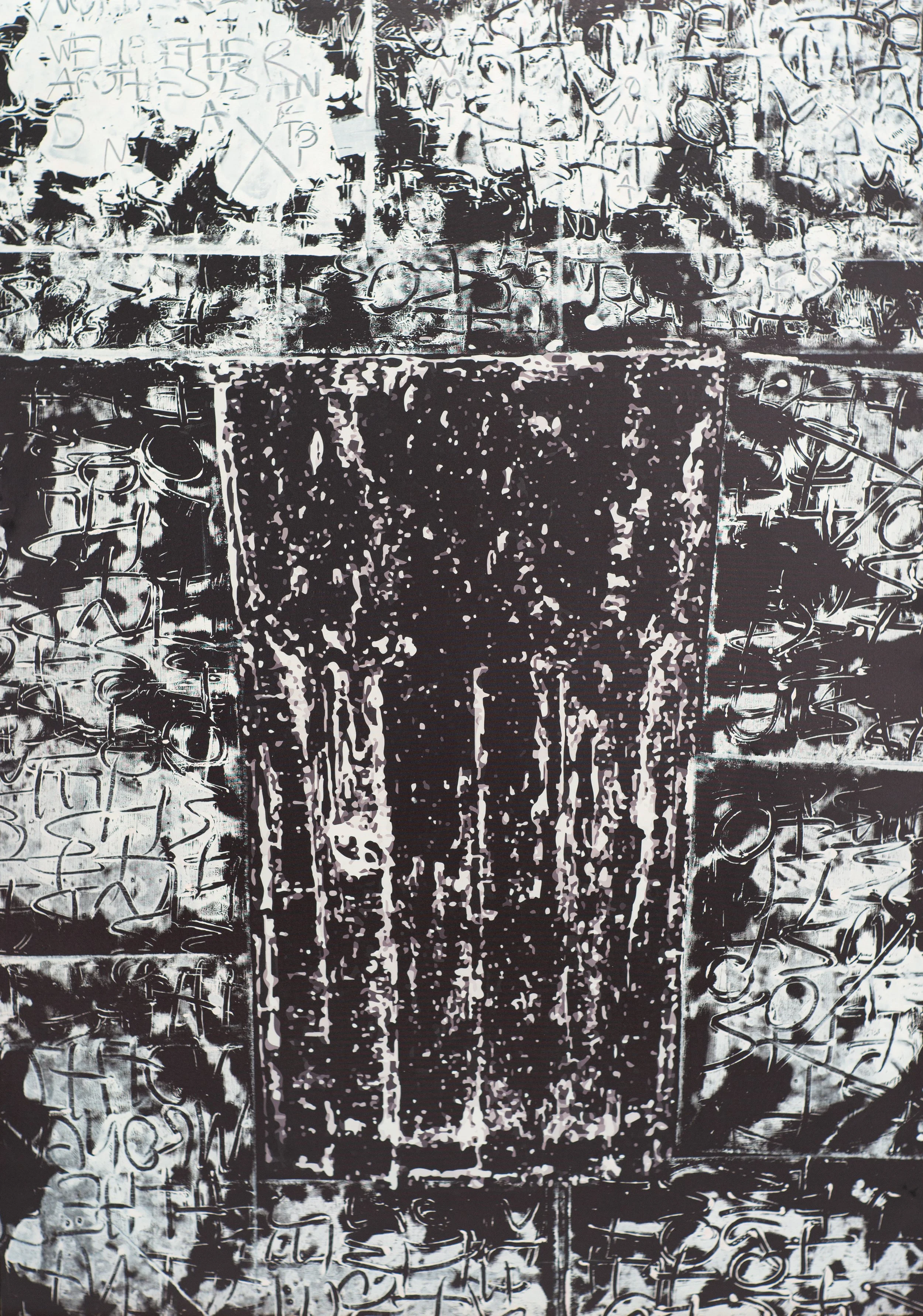 Semiotic spaces, 2024, ink transfer and acrylic on canvas - 200 x 180 x 4 cm